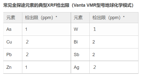 大多數金礦床都有其特定的地球化學特征(如上表所示)。XRF分析儀可以探測到這些地球化學特征,從而可使地質學家更清楚地了解他們正在勘查的地質系統。典型的金探途元素包含As、Cu、Pb、Zn、Sb、Bi、Ag和W。