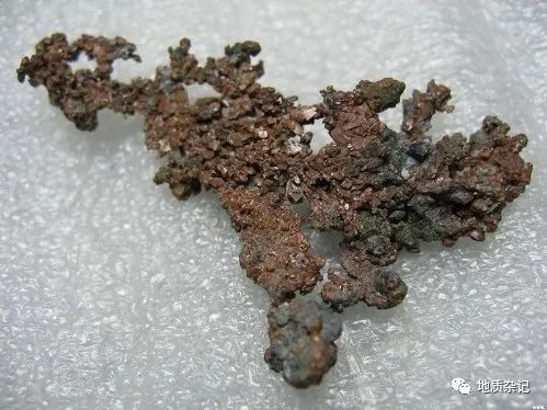 成分Cu,原生自然銅成分中有時含銀和金等。等軸晶系。晶體呈立方體,但少見;一般呈樹枝狀、片狀或致密塊狀集合體。銅紅色,表面易氧化成褐黑色。條痕呈光亮的銅紅色。金屬光澤。硬度2.5~3。具強延展性。斷口呈鋸齒狀。為電和熱的良導(dǎo)體。密度8.5~8.9g/cm3。