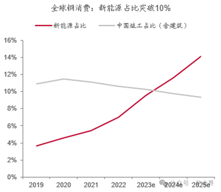 新能源領域對銅需求的增量,已基本上抵消了國內傳統房地產下滑所帶來的負面影響。近日,中泰證券研究所有色金屬首席分析師謝鴻鶴曾表示,2023年全球新能源制造對銅鋁的消費量已經占到總消費量的10%,而國內房地產竣工端對銅鋁(指狹義的直接使用部分)的消費也在2023年被“壓縮”到了10%附近。