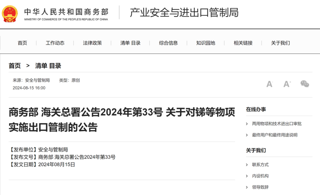 15日下午,商務部、海關總署聯合發布了《關于對銻等物項實施出口管制的公告》(下稱“公告”)。公告顯示,根據相關規定,為維護國家安全和利益、履行防擴散等國際義務,經國務院批準,決定對銻等物項實施出口管制。公告自2024年9月15日起正式實施。
