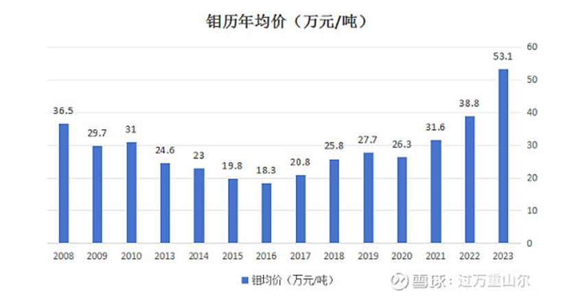 自2017年以來,在鉬供應(yīng)端產(chǎn)量保持穩(wěn)定,而鉬需求穩(wěn)步提升的背景下,全球和國內(nèi)鉬行業(yè)供需格局都呈現(xiàn)緊平衡狀態(tài),鉬價(jià)格也進(jìn)入上漲周期,2023年鉬均價(jià)達(dá)到了53.1萬噸。未來兩年,鉬的供給端增量不大,增量集中于2027年及以后,主要是沙坪溝項(xiàng)目投產(chǎn),新增2.72萬噸產(chǎn)能,以及大黑山鉬礦擴(kuò)產(chǎn),新增0.64萬噸。