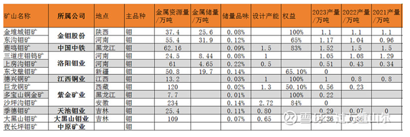 從企業(yè)來看,國內(nèi)鉬礦相關(guān)有金鉬股份、洛陽鉬業(yè)、中國中鐵(鹿鳴礦業(yè))、江西銅業(yè)(德興銅礦)、紫金礦業(yè)(巨龍銅礦、沙坪溝鉬礦、多寶山銅礦)等,上述5家企業(yè)2023年合計(jì)產(chǎn)量約7.16萬噸,約占國內(nèi)市場的65%。金鉬股份是國內(nèi)最大的鉬礦開采及鉬產(chǎn)品生產(chǎn)商,擁有陜西的金錐城鉬礦與河南的東溝鉬礦兩個(gè)核心礦山,產(chǎn)能都在一萬噸左右。