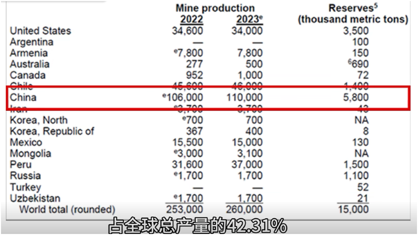 鉬,作為一種重要的不可再生的稀缺性戰(zhàn)略資源,以其獨(dú)特的性能廣泛應(yīng)用于鋼鐵冶金、農(nóng)用化肥、電氣化工和航天等領(lǐng)域。根據(jù)USGS數(shù)據(jù)顯示,2023年,中國鉬礦資源儲量為580萬噸,占全球資源儲量的38.67%。其次為美國和秘魯,2023年鉬礦資源儲量分別為350萬噸和150萬噸,分別占比23.33%和10.00%。同時(shí),中國也是全球最大的鉬生產(chǎn)國,據(jù)美國地質(zhì)調(diào)查局?jǐn)?shù)據(jù)顯示,2023年,全球鉬產(chǎn)量約26萬噸,其中,中國約11萬噸,約占全球總產(chǎn)量的42.3%。