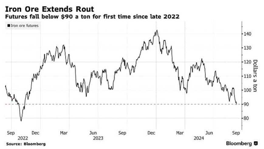 9月9日,新加坡鐵礦石期貨價格周一亞洲時段早盤跌幅一度高達(dá)2.3%,至每噸89.60美元,自2022年11月以來首次跌破了90美元大關(guān),為22個月以來最低水平。國內(nèi)青島港的鐵礦石價格也跌至90美元/干噸左右。昔日被業(yè)內(nèi)譽(yù)為“瘋狂的石頭”的鐵礦石,如今正在以罕見的速度向下墜落。