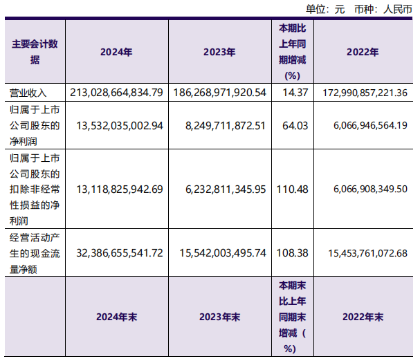 3月21日,洛陽鉬業(yè)發(fā)布的業(yè)績報告顯示,公司2024年營業(yè)收入首次邁入兩千億元門檻,為2130.29億元,同比增長14.37%;歸母凈利潤首破百億元,為135.32億元,同比增長64.03%;扣非后歸母凈利潤131.19億元,同比增長110.48%;每股收益0.63元,同比增長65.79%。