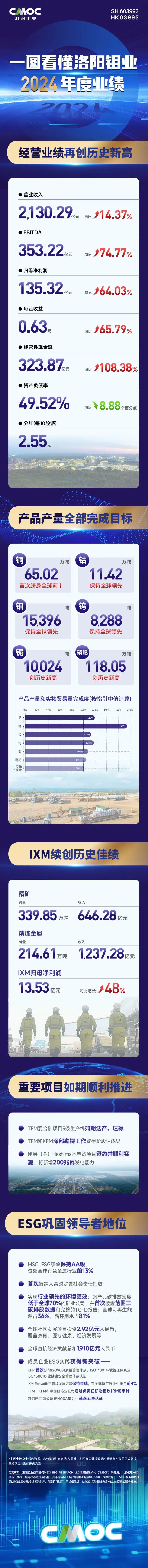 與業(yè)績增長同步,洛陽鉬業(yè)繼續(xù)踐行高標(biāo)準(zhǔn)ESG理念。公司MSCI ESG績效保持AA級,位處全球有色金屬行業(yè)前13%,首次被納入富時羅素社會責(zé)任指數(shù)。公司銅產(chǎn)品碳排放密度低于全球70%的礦業(yè)公司,首次披露范圍三碳排放數(shù)據(jù);2024年全球經(jīng)濟(jì)貢獻(xiàn)達(dá)1,910億元,全球社區(qū)投資2.92億元。