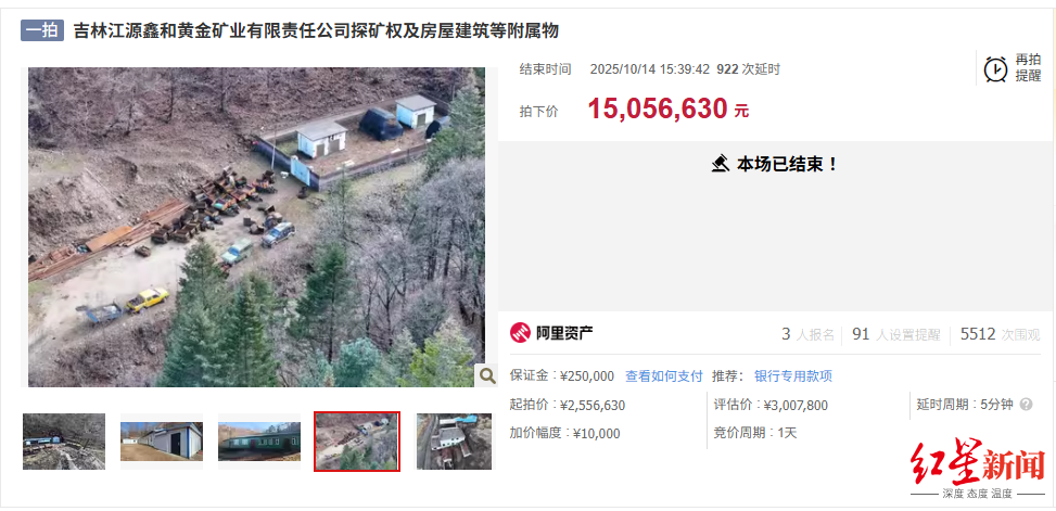 紅星資本局近日消息,吉林江源鑫和黃金礦業有限責任公司探礦權及房屋建筑等附屬物在阿里資產拍賣平臺被拍賣,本次拍賣經過931輪出價(包括922次延時出價),最終以1505.663萬元的價格成交,對比起拍價255.663萬元,溢價1250萬元,溢價率達489%。
